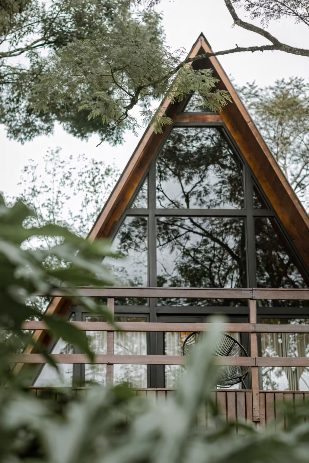 Chalé em estilo A-frame, com varanda e vidros que integram o interior à mata. O canto dos passarinhos, o cheiro do campo e o calor de um café na varanda fazem da estadia uma pausa de verdade.